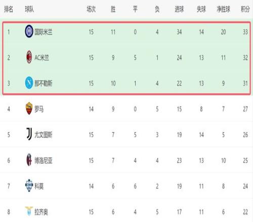 不得不说,国米确实太争气了,在榜首2强都爆冷的情况下,他们没有让意外发生,而这场胜利,也让国米反超对手,在意甲积分榜登顶。截至目前,国米以1分的优势排名第一,而AC米兰和那不勒斯则退居第二和第三位,不过榜首3强的差距只有2分,接下来意甲争冠还有很大的变数。