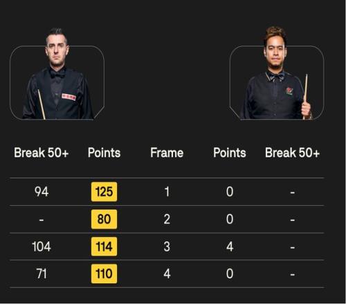 本场比赛,塞尔比一改往日“磨王”本色,平均出杆时间控制在20.6秒,开局就火力全开,首局轰出单杆94分,125-0;第二局80-0;第三局塞尔比尝试冲击147,可惜停留在第14颗红球,打出单杆104分,桑坎姆则是在这一局依靠对手罚分拿到4分;塞尔比在第四局再轰单杆71分,以110-0第三次单局零封桑坎姆,强势晋级苏格兰公开赛8强。